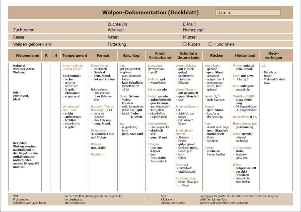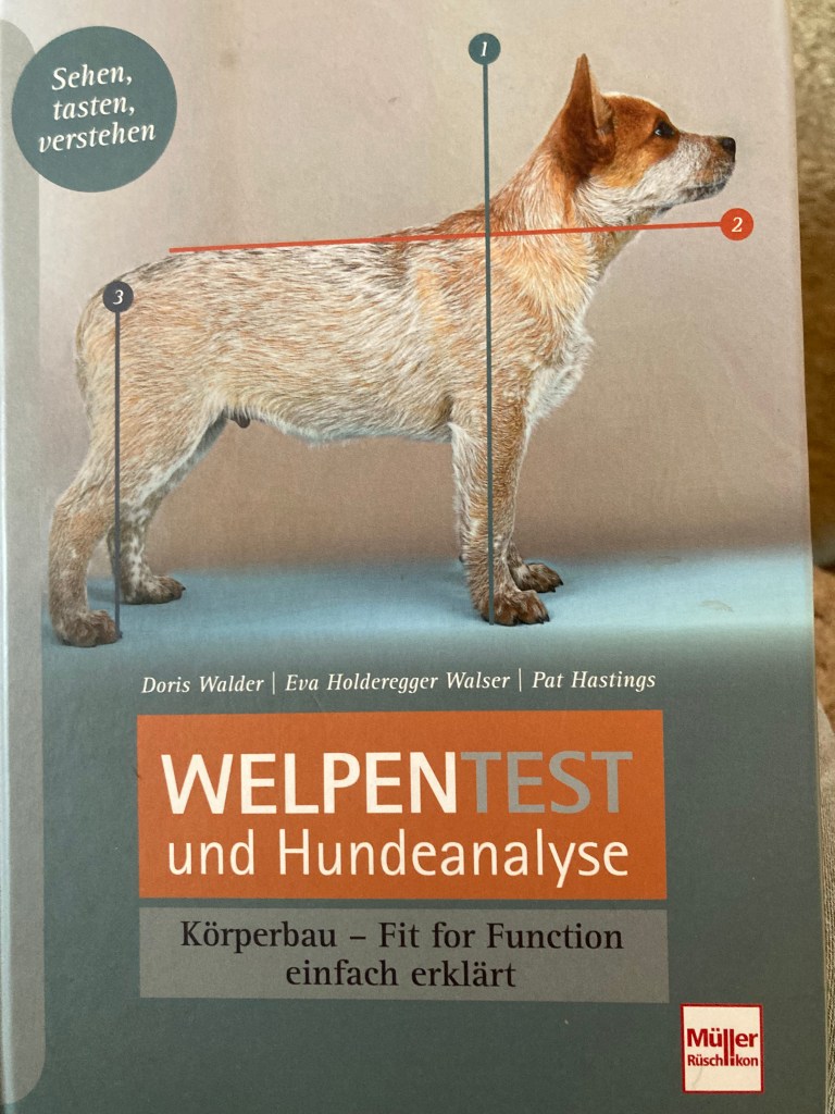 Mit 8 Woche +/- 3 Tagen fotografieren wir die Welpen gemäss diesem Buch und versuchen anhand dem Welpentest die Welpen körperlich zu beurteilen. „Mit 8 Wochen hat der Welpe ungefähr die Struktur, die er auch als erwachsener Hund haben wird.“ (Zitat aus dem Buch)